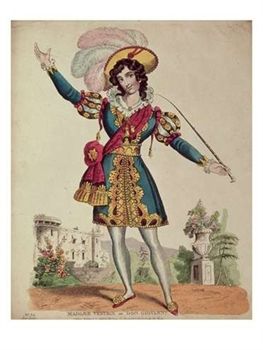 Lucia Vestris played many breeches parts such as Don Giovanni and MacHeath. In 1830 James Planche began working with her in burlesques, which were similar to pantomimes, but included daring and extravagant sets.In 1838 she married Charles Mathews. They took over the management of Covent Garden Theatre and put on the first known version of Love’s Labour Lost since 1605, with herself as Rosaline. In 1840 she starred in the first relatively uncut A Midsummer Night’s Dream casting herself as Oberon, which started a tradition of female Oberons that lasted for 70 years. Her legs became very famous, and plaster casts of them were sold. There is even a song about such casts being stolen. She was still playing Breeches Parts when she was fifty.