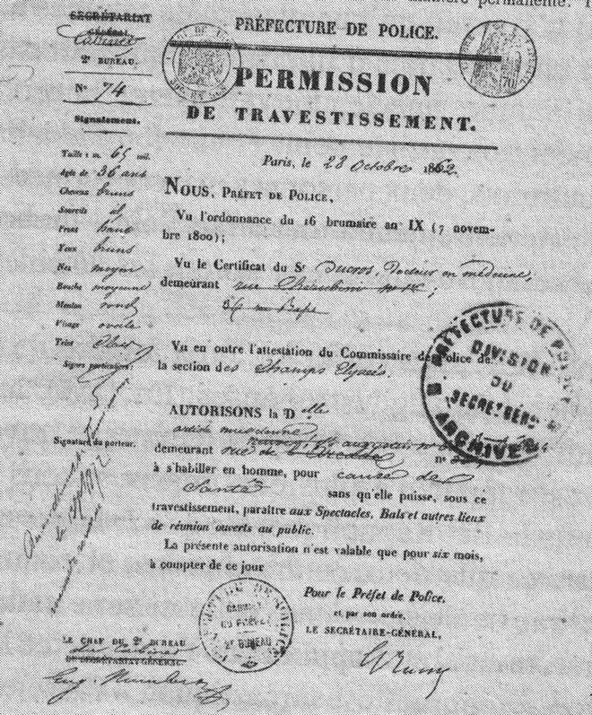 « Le Préfet de Police, Informé que beaucoup de femmes se travestissent, et persuadé qu'aucune d'elles ne quitte les habits de son sexe que pour cause de santé ; Considérant que les femmes travesties sont exposées à une infinité de désagréments, et même aux méprises des agents de la police, si elles ne sont pas munies d'une autorisation spéciale qu'elles puissent représenter au besoin ; Considérant que cette autorisation doit être uniforme, et que, jusqu'à ce jour, des permissions différentes ont été accordées par diverses autorités ; Considérant, enfin, que toute femme qui, après la publication de la présente ordonnance, s'habillerait en homme, sans avoir rempli les formalités prescrites, donnerait lieu de croire qu'elle aurait l'intention coupable d'abuser de son travestissement, Ordonne ce qui suit : 1 - Toutes les permissions de travestissement accordées jusqu'à ce jour, par les sous-préfets ou les maires du département de la Seine, et les maires des communes de Saint-Cloud, Sèvres et Meudon, et même celles accordées à la préfecture de police, sont et demeurent annulées. 2 - Toute femme, désirant s'habiller en homme, devra se présenter à la Préfecture de Police pour en obtenir l'autorisation. 3 - Cette autorisation ne sera donnée que sur le certificat d'un officier de santé, dont la signature sera dûment légalisée, et en outre, sur l'attestation des maires ou commissaires de police, portant les nom et prénoms, profession et demeure de la requérante. 4 - Toute femme trouvée travestie, qui ne se sera pas conformée aux dispositions des articles précédents, sera arrêtée et conduite à la préfecture de police. 5 - La présente ordonnance sera imprimée, affichée dans toute l'étendue du département de la Seine et dans les communes de Saint-Cloud, Sèvres et Meudon, et envoyée au général commandant les 15e et 17e divisions militaires, au général commandant d'armes de la place de Paris, aux capitaines de la gendarmerie dans les départements de la Seine et de Seine et Oise, aux maires, aux commissaires de police et aux officiers de paix, pour que chacun, en ce qui le concerne, en assure l'exécution. » Le Préfet de Police Dubois | "The Prefect of Police, Informed that many women transvest, and persuaded that none of them abandon the dress of her sex for health reasons; Whereas women transvestites are exposed to endless inconvenience, even to the point of police officers' contempt, if they are not equipped with a special authorization that they show when necessary; Whereas this authorization should be uniform, and that, until now, different permissions were granted by various authorities; Whereas, finally, that any woman who, after the publication of this order, would dress as a man, without having fulfilled the prescribed formalities, will give reason to believe that she has culpable intent of abusing her transvestment. Orders as follows: 1 - All permissions of transvestity to this day, issued by sub-prefects and mayors of the Department of the Seine, and the mayors of St. Cloud, Sevres and Meudon, and even by the prefecture of Police are and shall remain cancelled. 2 - Any woman who wishes to dress like a man, must appear at the Prefecture of Police to get permission. 3 - This authorization will be given only with the certificate of a medical officer, whose signature will be duly acknowledged, moreover, with the certificate of mayors or police commissioners, with the full name, occupation and residence of the applicant. 4 - Any woman found transvesting, who has not complied with the foregoing provisions, shall be arrested and taken to Prefecture of Police. 5 - This Ordinance shall be printed, displayed throughout the extent of the department of Seine and in the communes of Saint-Cloud, Sevres and Meudon, and sent to the commanding general of the 15th and 17th military divisions, commanding general of arms of the Paris area, the captains of the gendarmerie in the departments of Seine and Seine et Oise, mayors, police commissioners and peace officers, so that everyone, will assure compliance. " The Prefect of Police Dubois |