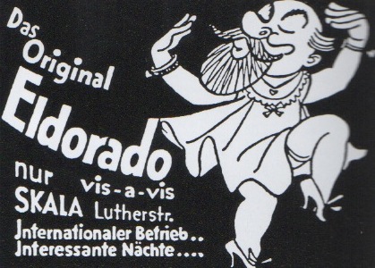The film Geheimnisse einer Seele (Secrets of a Soul), 1926, was partly filmed there. G W Pabst (dir) Hans Casparius (camera). Casparius intended to make a second film at Eldorado, Sex Shades, and met what he took to be a suitable transvestite. However when he asked why she was a transvestite, she replied “Because I earn much more that way”. Casparius was repelled by her lack of integrity, and called off the project.