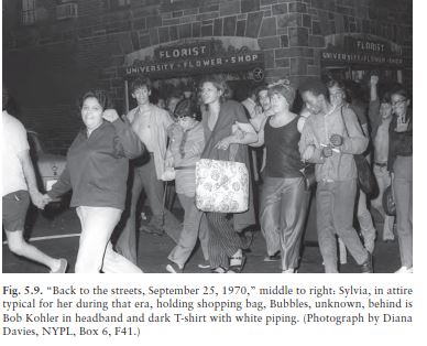 As Sylvia immersed herself in gay liberation, she failed to attend to her everyday life, and she lost her job, her home, her dog, her sewing machine and her relationship with Gary. She was sitting in the park on Christopher Street, across from the Stonewall tavern, with her suitcase and shopping cart, when Bob Kohler came by and told her of the sit-in at Weinstein Hall. He pushed her shopping cart for her. She was pleased to see friends among the other volunteers: Marsha Johnson and Bubbles Rose Lee. They discovered a matron’s bathroom, and Sylvia and others from the street were able to clean up.