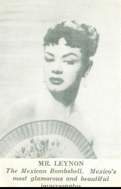 Leynon, from Mexico, was a well-known performer in US female-impersonation nightclubs in the 1950s. When Perry Desmond was hired for a first chance as a performer at New Orleans’ My-O-My Club in 1956, Leynon stepped in to help Desmond with make-up and costume.